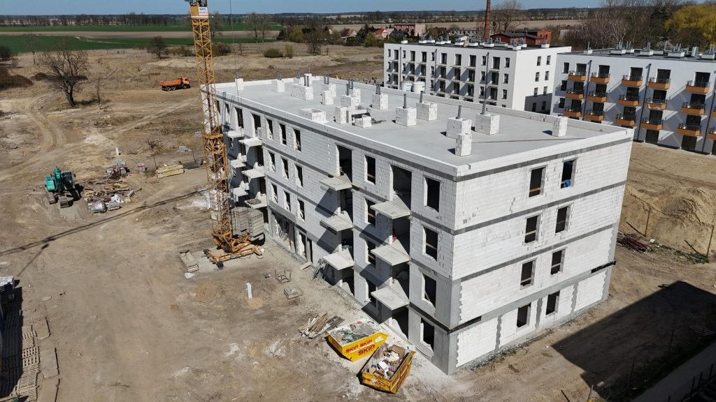 Równolegle z zagospodarowaniem terenu prowadzimy intensywne działania w budynku F. Zakończyliśmy wznoszenie ostatniej kondygnacji i przeszliśmy do prac przy montażu więźby dachowej. Wewnątrz budynku murowane są obecnie ścianki działowe, a wkrótce rozpoczniemy montaż instalacji sanitarnych i elektrycznych. Kolejne etapy obejmą przygotowanie do tynków wewnętrznych i dalszych prac wykończeniowych.