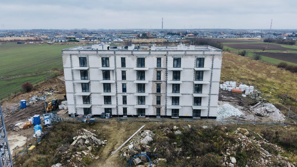 Budowa Osiedla Wajdy 20 w Kutnie rozwija się dynamicznie na wielu frontach jednocześnie. Zakończone przyłącza, zaawansowane instalacje i widoczne postępy na kondygnacjach mieszkalnych pokazują, że inwestycja wchodzi w etap intensywnych prac wykończeniowych.